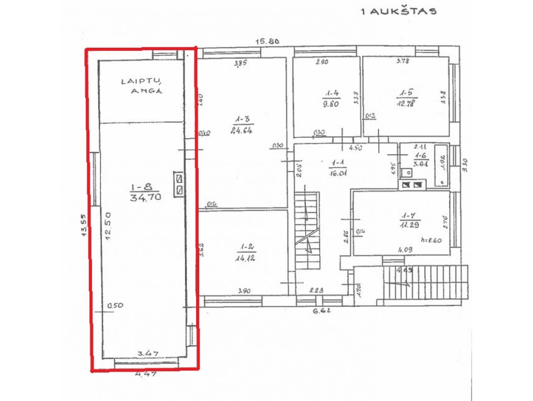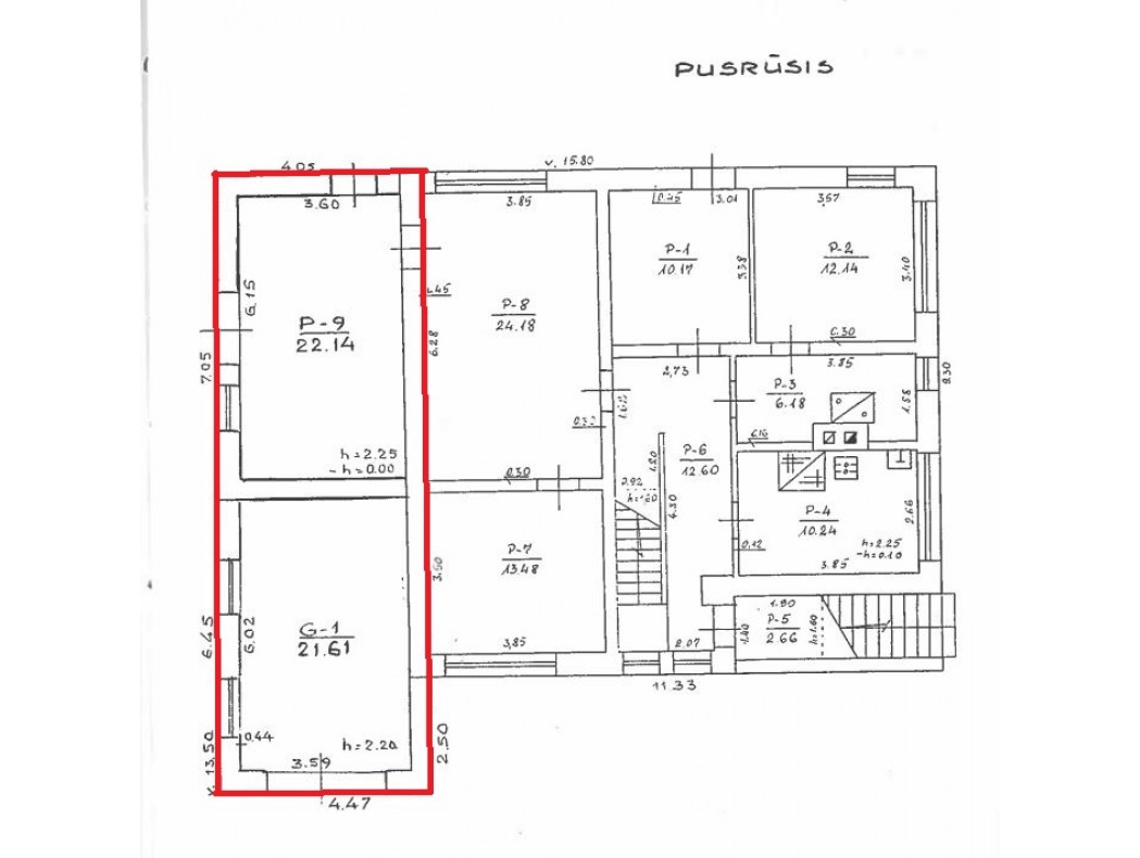 - pusrūsio patalpos 22.14 m2 ir garažas 21.61 m2.