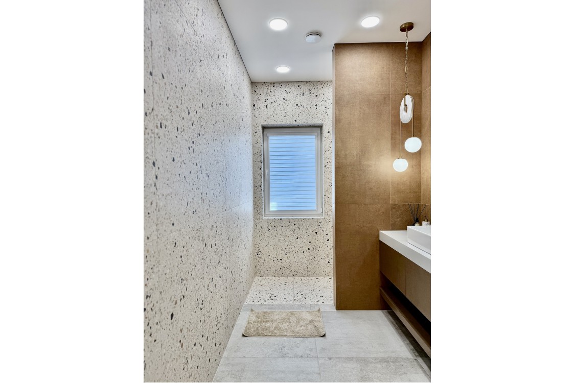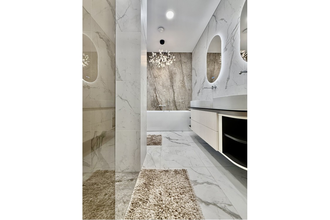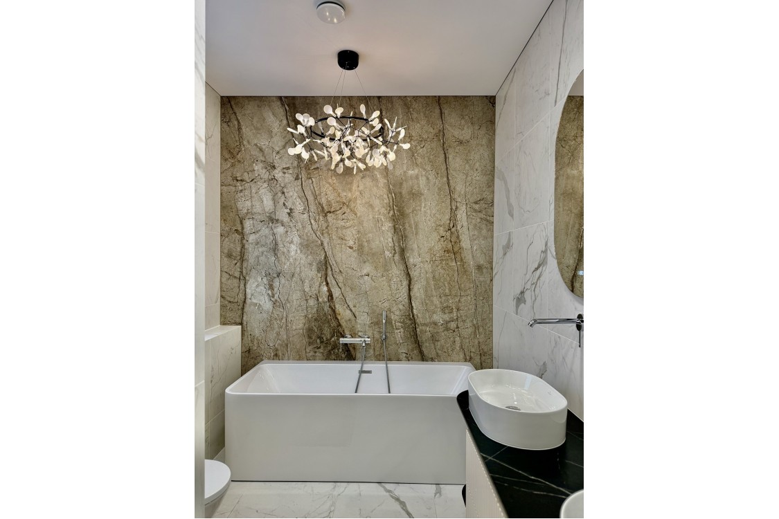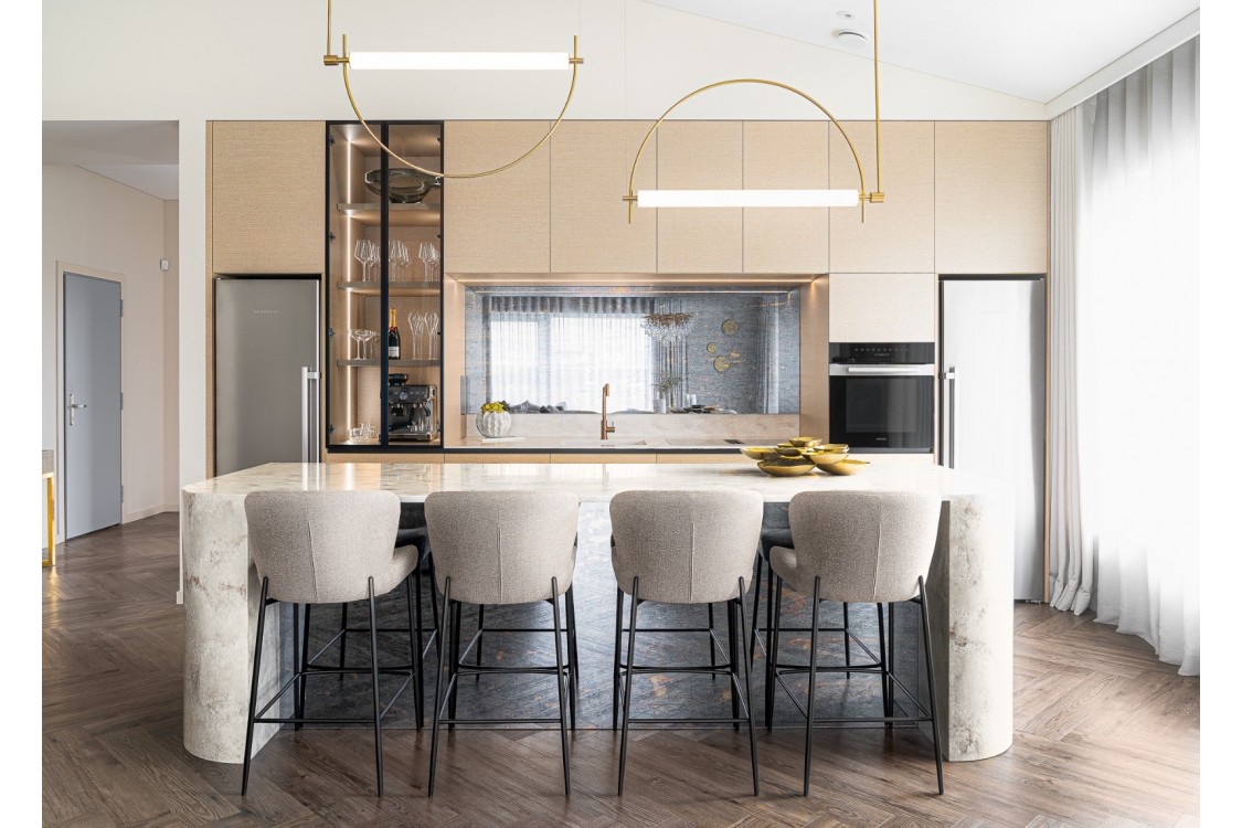 - 63,10 m² svetainė su virtuve – erdvi, šviesi, su didžiule sala, prabangiomis apdailos medžiagomis bei visa integruota buitine technika. Tai namų širdis, kurioje patogu tiek kasdienai, tiek priimti svečius.